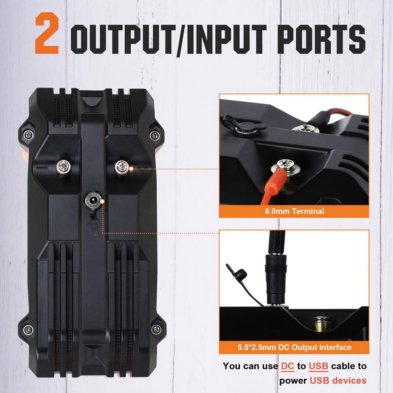 ·Creative Design: Heat emission holes added to help battery cool down. M5 terminal and DC 5.5*2.5mm can charge and discharge at the same time.