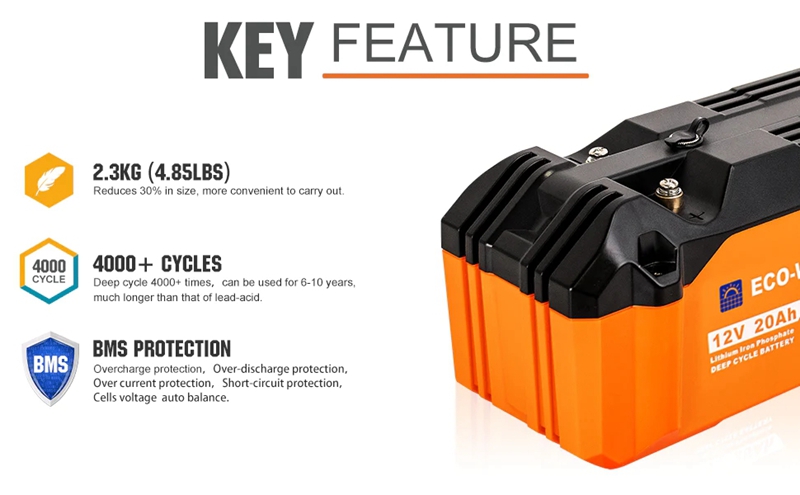 Overcharge/Over-discharge/Over-temperatureECO-WORTHY 12V 20Ah Portable LiFePO4 Deep Cycle Rechargeable Battery is suitable for various outdoor applications: fishfinder, trolling motor, camping, RV, boat, ect.