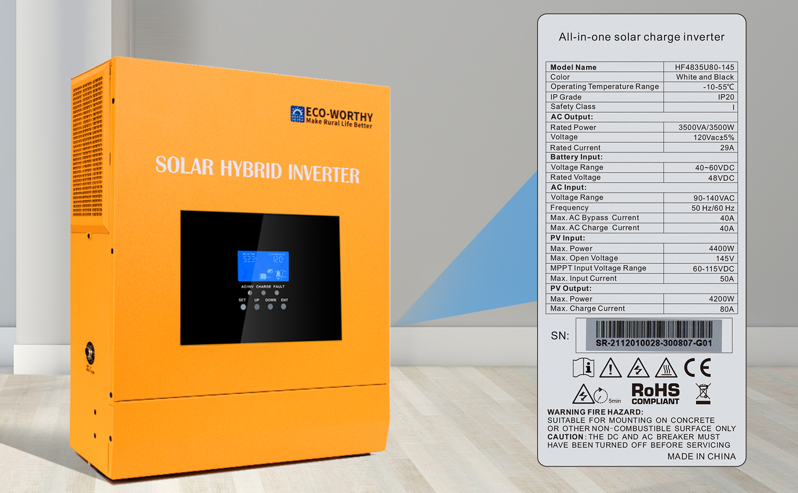 ECO-WORTHY 3500W all-in-one hybrid inverter has a UPS function which can automatically switch between [PV & Mains Powered] or [Battery & Mains Powered]. The priority can be selected manually.