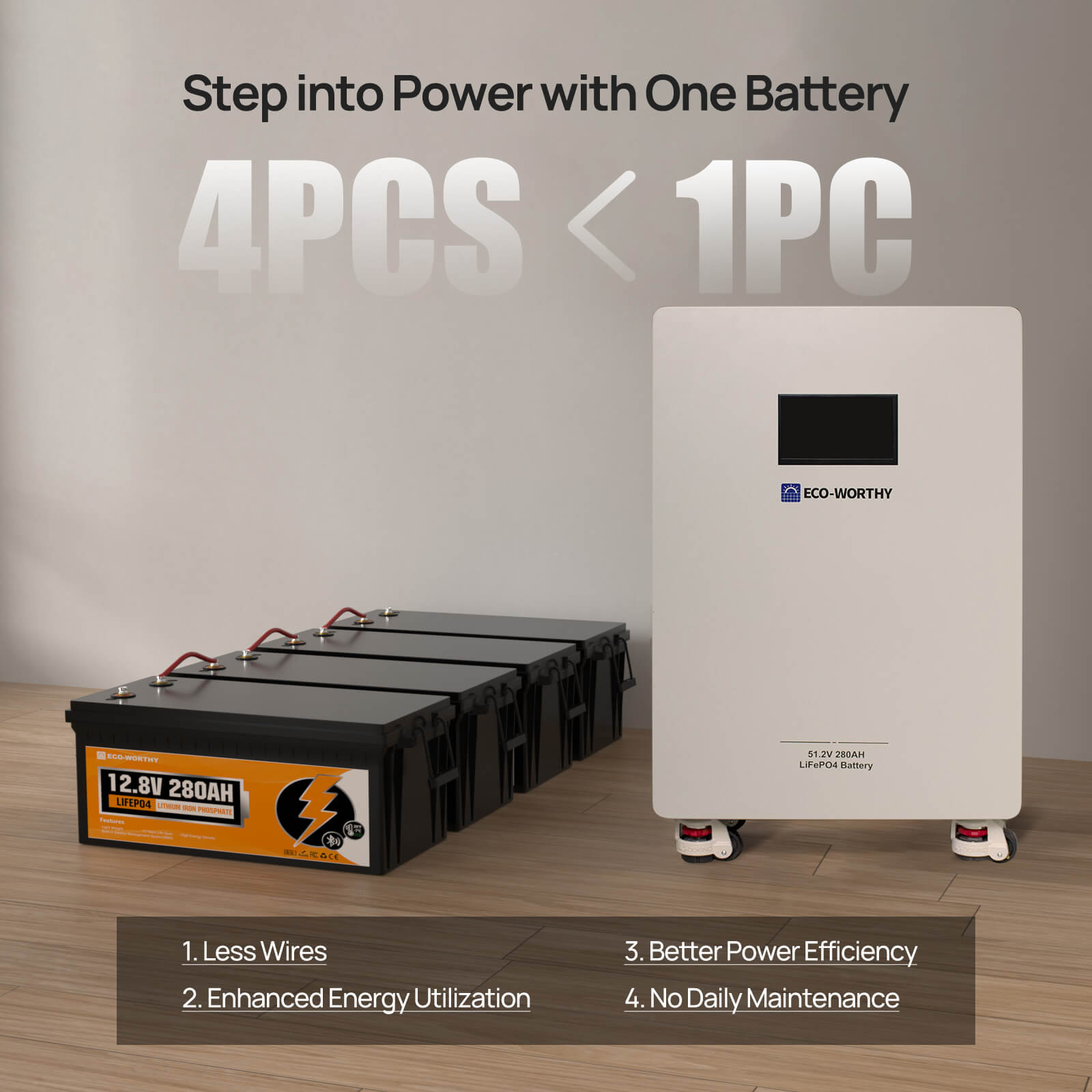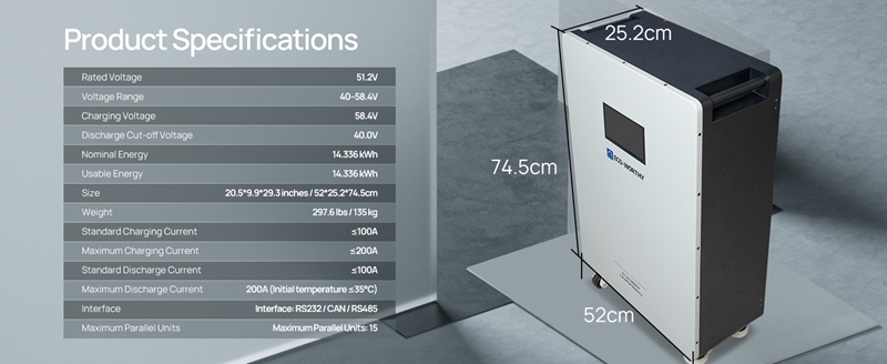 Large Capacity: 16 pieces of 280Ah high-quality Grade-A cells are connected in series, one battery can store 14.336kWh of electricity, and up to 15 batteries can be connected in parallel.Convenient Monitoring: This battery features an upgraded, larger display that clearly shows key information, including the capacity, voltage, current, temperature, and cell status of both the master and slave batteries, built-in communication interface supports connection to the host computer or inverter for communication.Dual Protection: The built-in 200A PACE BMS offers intelligent protection with high/low temperature, overcurrent, and overvoltage protection. A 250A circuit breaker with an integrated shunt trip unit ensures quick disconnection of battery input and output in case of emergencies, ensuring electrical safety.Thoughtful Installation Design:The upgraded battery features detachable terminals for easy installation and flexible expansion. It is also equipped with four durable Footmaster Nylon wheels and L-shaped brackets, allowing for effortless mobility while ensuring secure fixation in a specific position.Extremely Long Life: Designed for long-term use, the battery cell has a DOD of more than 80% after 10,000 cycles, providing you with a service life of more than ten years.