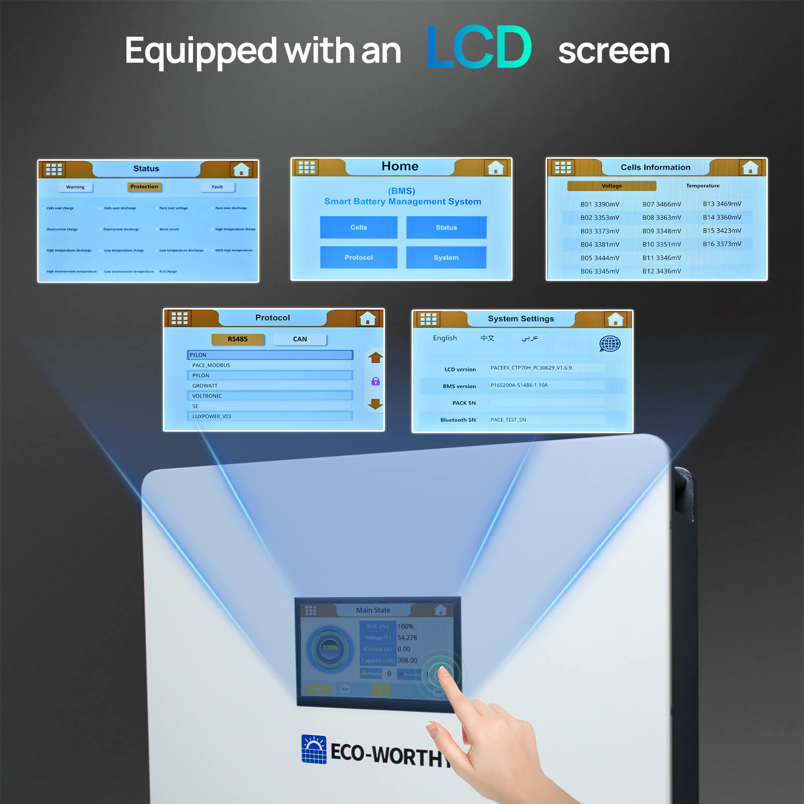 Large Capacity: 16 pieces of 280Ah high-quality Grade-A cells are connected in series, one battery can store 14.336kWh of electricity, and up to 15 batteries can be connected in parallel. Convenient Monitoring: This battery features an upgraded, larger display that clearly shows key information, including the capacity, voltage, current, temperature, and cell status of both the master and slave batteries, built-in communication interface supports connection to the host computer or inverter for communication. Dual Protection: The built-in 200A PACE BMS offers intelligent protection with high/low temperature, overcurrent, and overvoltage protection. A 250A circuit breaker with an integrated shunt trip unit ensures quick disconnection of battery input and output in case of emergencies, ensuring electrical safety. Thoughtful Installation Design:The upgraded battery features detachable terminals for easy installation and flexible expansion. It is also equipped with four durable Footmaster Nylon wheels and L-shaped brackets, allowing for effortless mobility while ensuring secure fixation in a specific position. Extremely Long Life: Designed for long-term use, the battery cell has a DOD of more than 80% after 10,000 cycles, providing you with a service life of more than ten years.