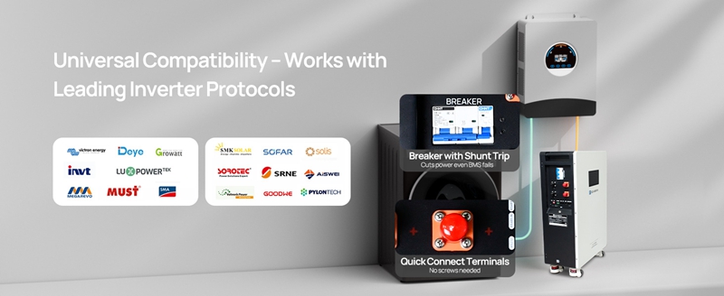 Quality Assurance:‌Powered by premium A-grade cells with extended lifespan. Enjoy 5-year after-sales support from a top DIY brand.Smart Monitoring: Supports CAN/RS485/RS232 communications. Pre-loaded with multi-brand inverter protocols for grid/backup/off-grid modes. Real-time monitoring via Bluetooth & WiFi connections. Access battery status through mobile apps or PC software.DIY Customizable Assembly: 3U rack-optimized design (61.9lbs) for single-person setup. Scalable to 32 parallel units with space-efficient stacking.High safety‌:Full-metal enclosure + 100A BMS (OC/OD/OC/SC/OTP safeguards) + 63A circuit breaker & master switch.Versatile & Powerful: Perfect for Home Energy Storage & UPS Backup Power. Includes all necessary cables for plug-and-play setup. Powers your shed, cabin, and enables off-grid living—say goodbye to electricity worries.