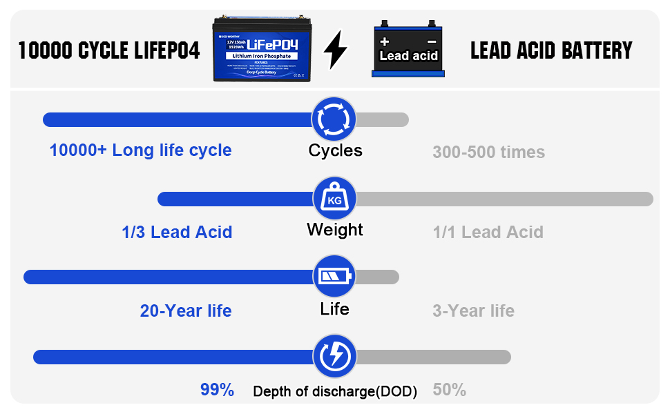 ECO-WORTHY  High performance series lithium battery can offer up to 10,000 error-free cycles. It can also offer numerous advantages over flooded and sealed lead acid batteries when used in renewable energy systems. Longer life, wider temperature range, true deep cycling, and safety are just the beginning.